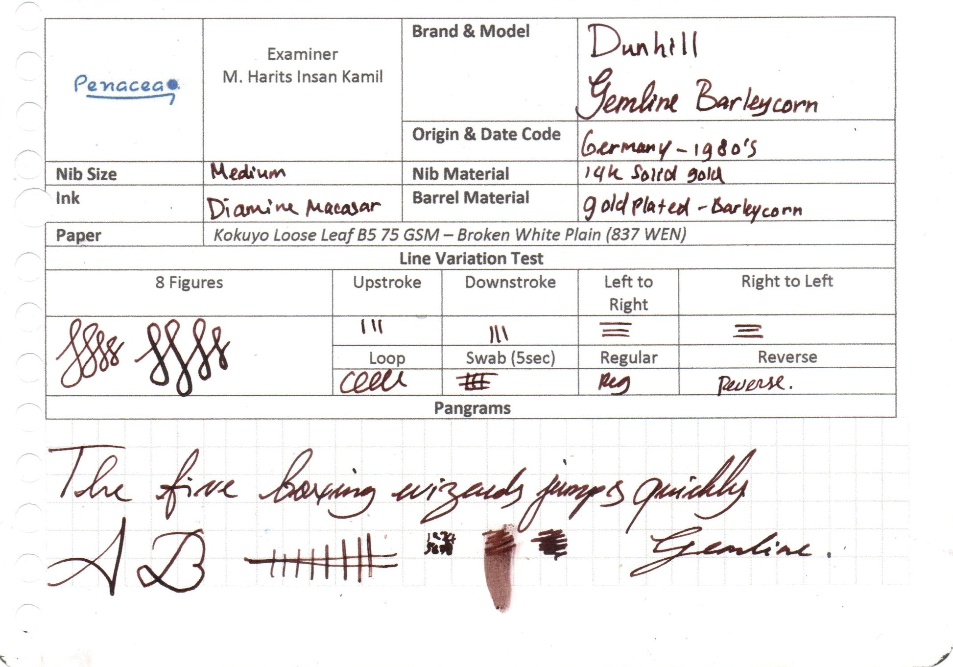 This Alfred Dunhill Gemline was made by Montblanc shortly after being acquired by Dunhill in around 1977. The gemline are similar to Montblanc's Noblesse with similar feed & nib configuration. there are two version of the feed, the earlier version uses plain ebonite feed while the later production model uses plastic feed similar to what Montblanc uses in their Montblanc Meisterstuck 144 & some of the Noblesse II model. Pen that are listed in here are made in early 1980s and uses plain ebonite feed with brown marble lacquer finish on clip & goldplated barleycorn pattern, Dunhill converter included. there are minor pitting spot on the barrel & clip.
