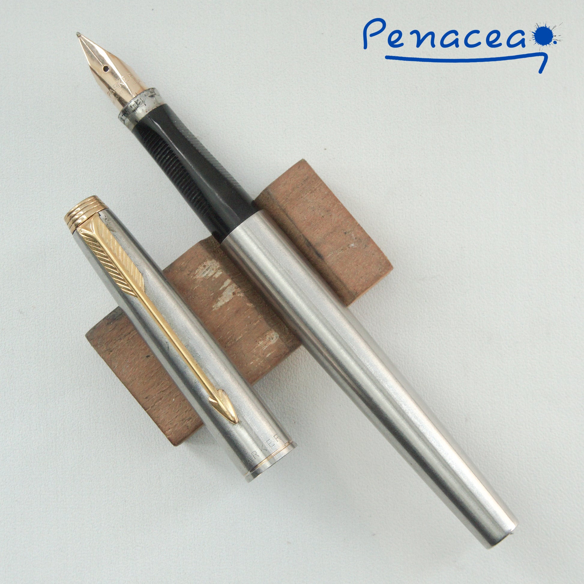 Parker 75 with dimpled tassies on cap in brushed steel barrel & cap. There is small pitting & corrosion on the front grip band and few scratches around the barrel & cap.