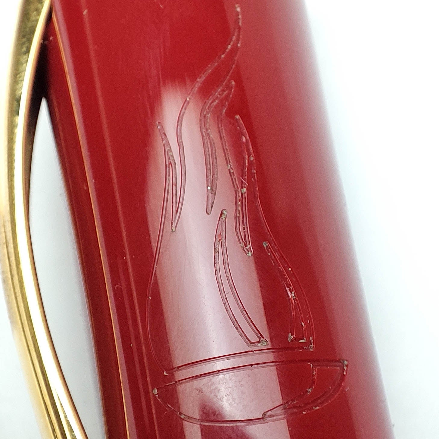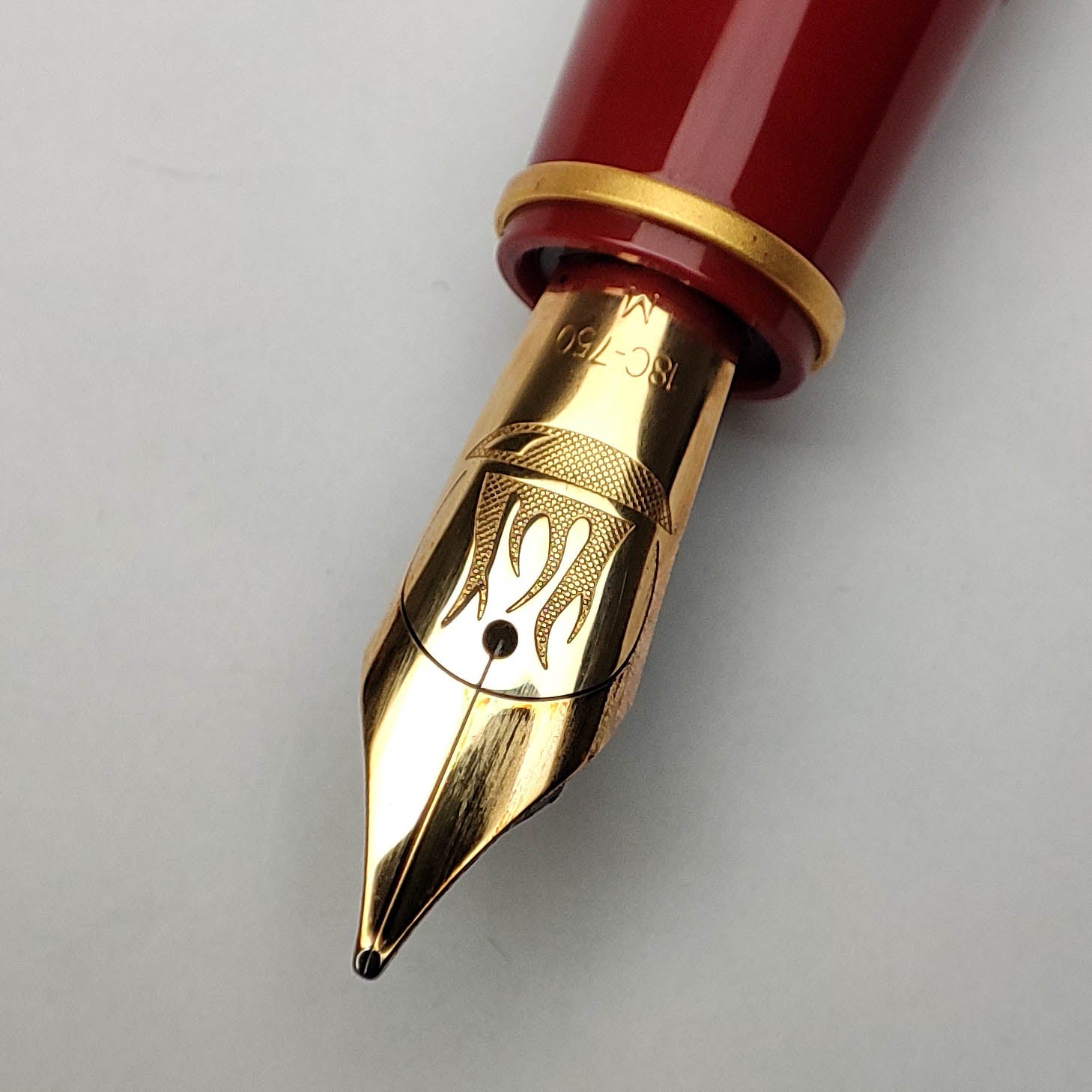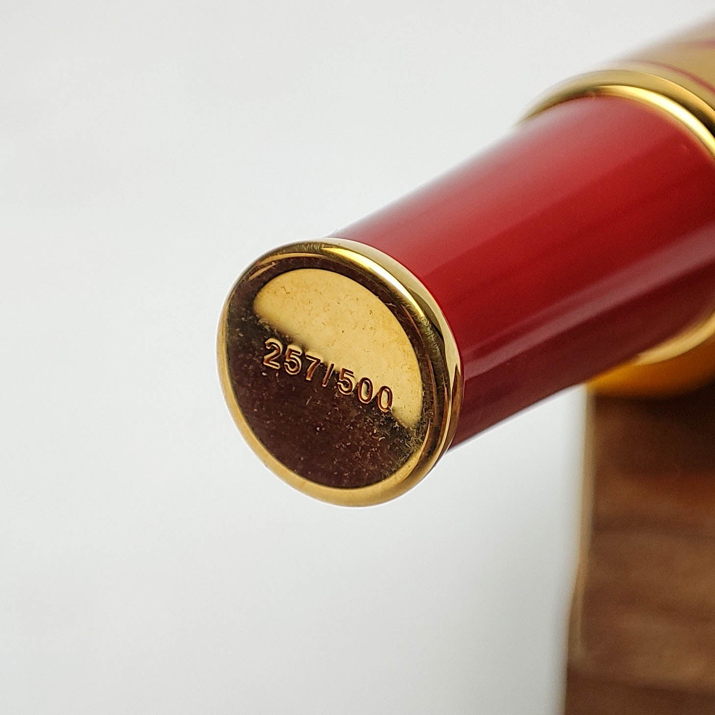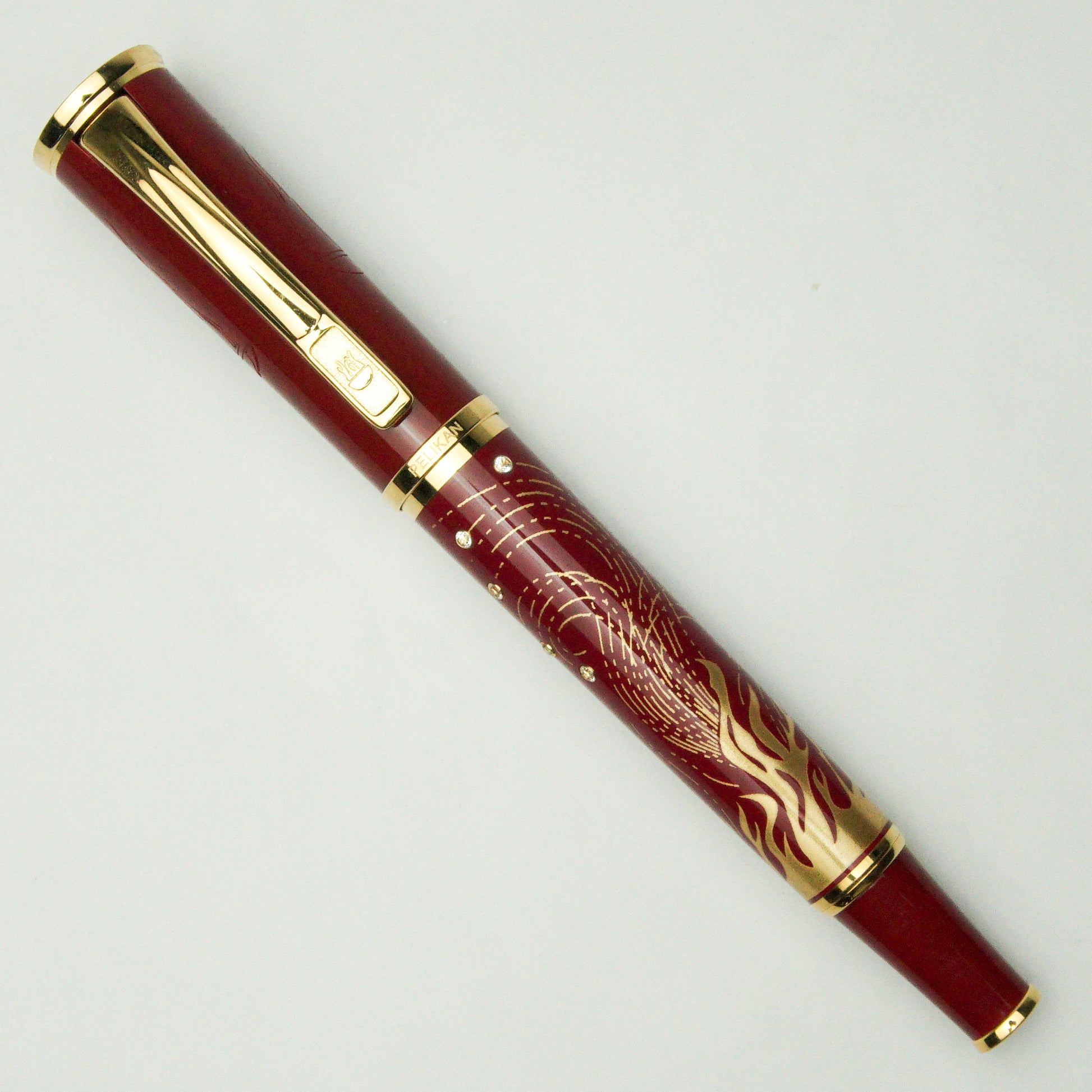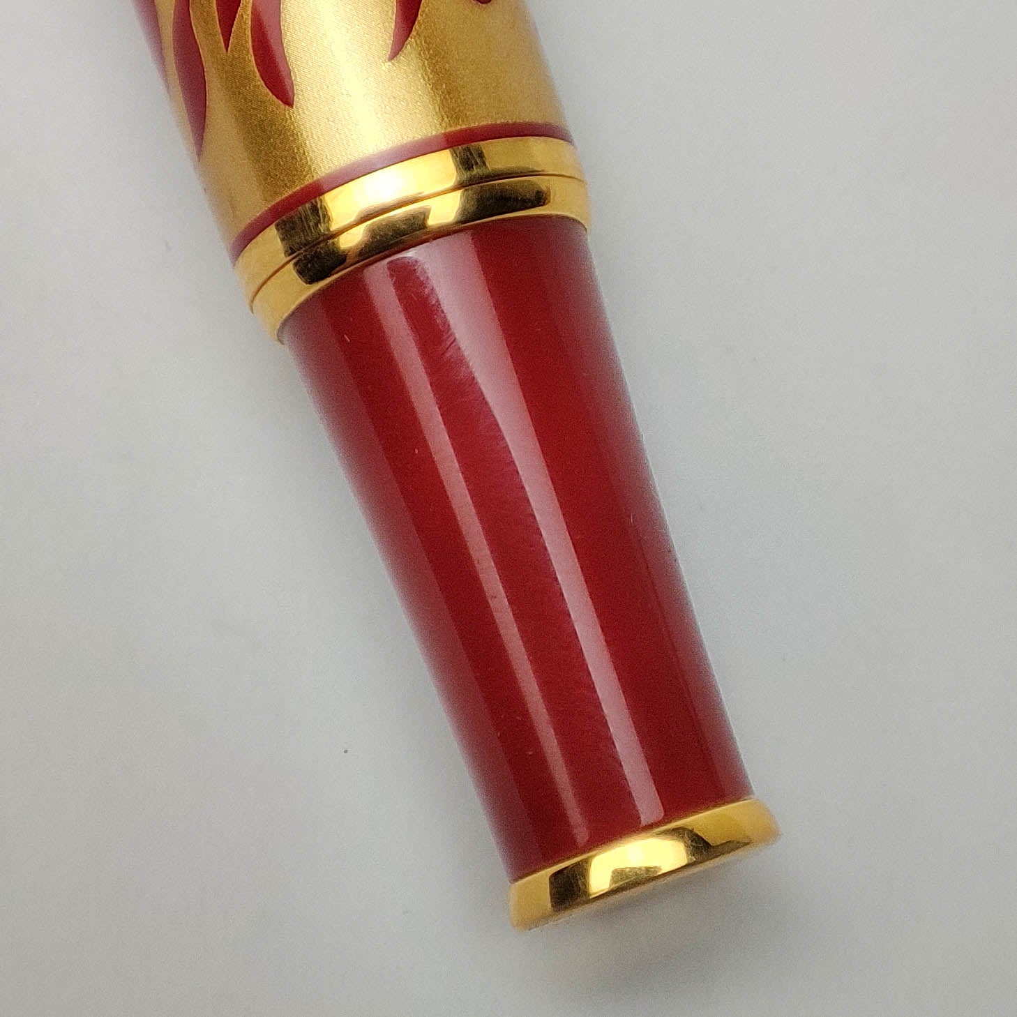The most important motif is the bowl filled with fire. History tells us that in former times, our ancestors had to wait for lightning to strike before they could ‘catch’ the flames. They filled skulls with oil in order to preserve the special flames that gave warmth, kept wild beasts at bay and helped to prepare food. Today, fire is just a match away, but to celebrate this achievement of civilization, the bowl of fire is depicted on the clip, the especially created nib, and the cap. The barrel is made of brass and lacquered several times in a vivid red. Every flame on the barrel is first lasered, then plated with 24 carat gold. Five real Topaz gem-stones make the sparks come alive. The nib is made of 18K gold with medium tipping, replaced box and genuine certificate & documentation for this exact pen.