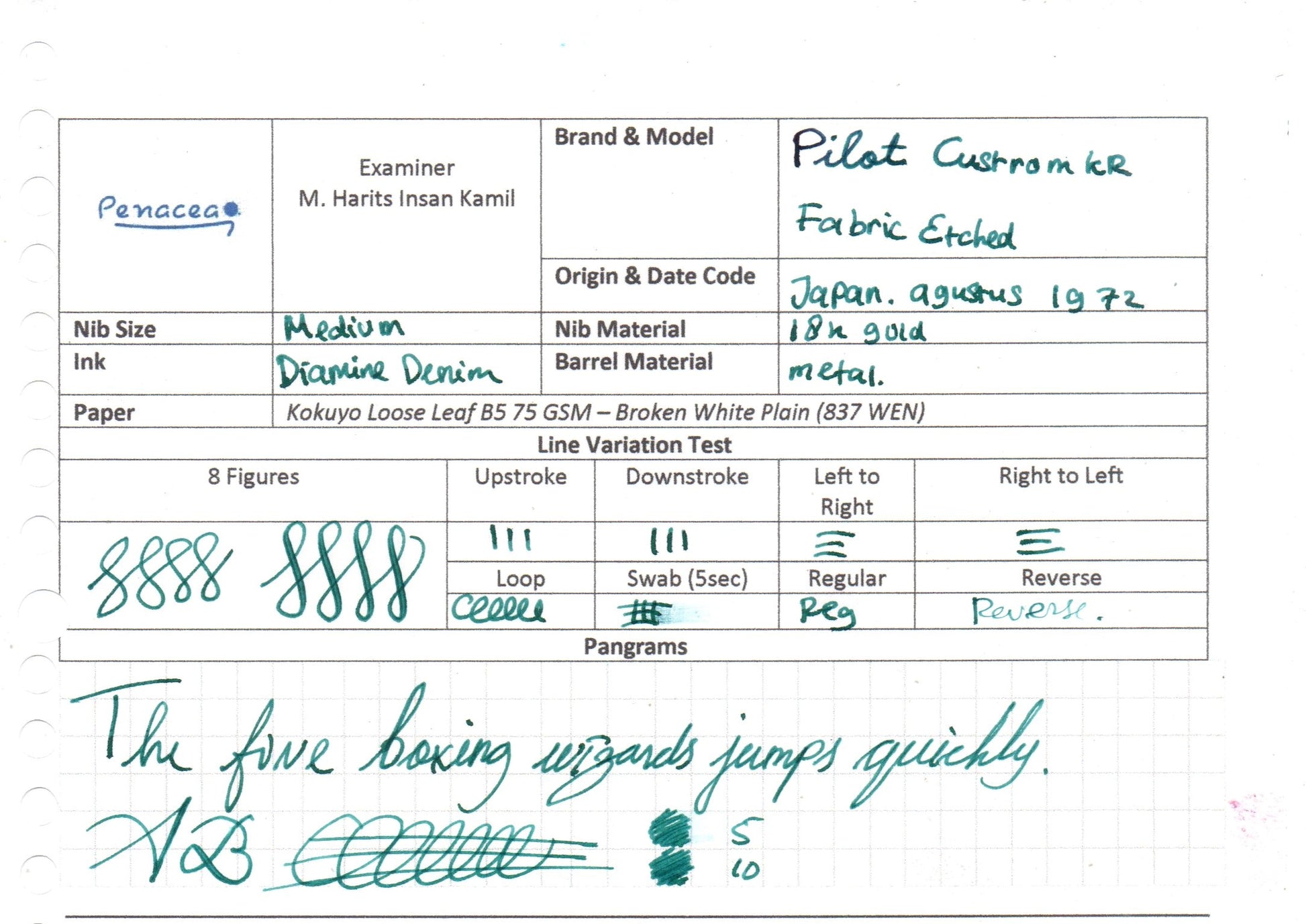 There are no official codes issued by Pilot for several patterns from the 1970s Pilot Custom, namely some rare variants such as Heart of Sutra Sterling Silver, Heart of Sutra Lacquered, Bible verses, Tree Bark, Geometric and one of them is Fabric Etched. Highly collectible for those who have already jumped in for the old Custom Pilot collection with an inlaid nib which is quite popular and sought after, namely the black etched stripe pattern model.