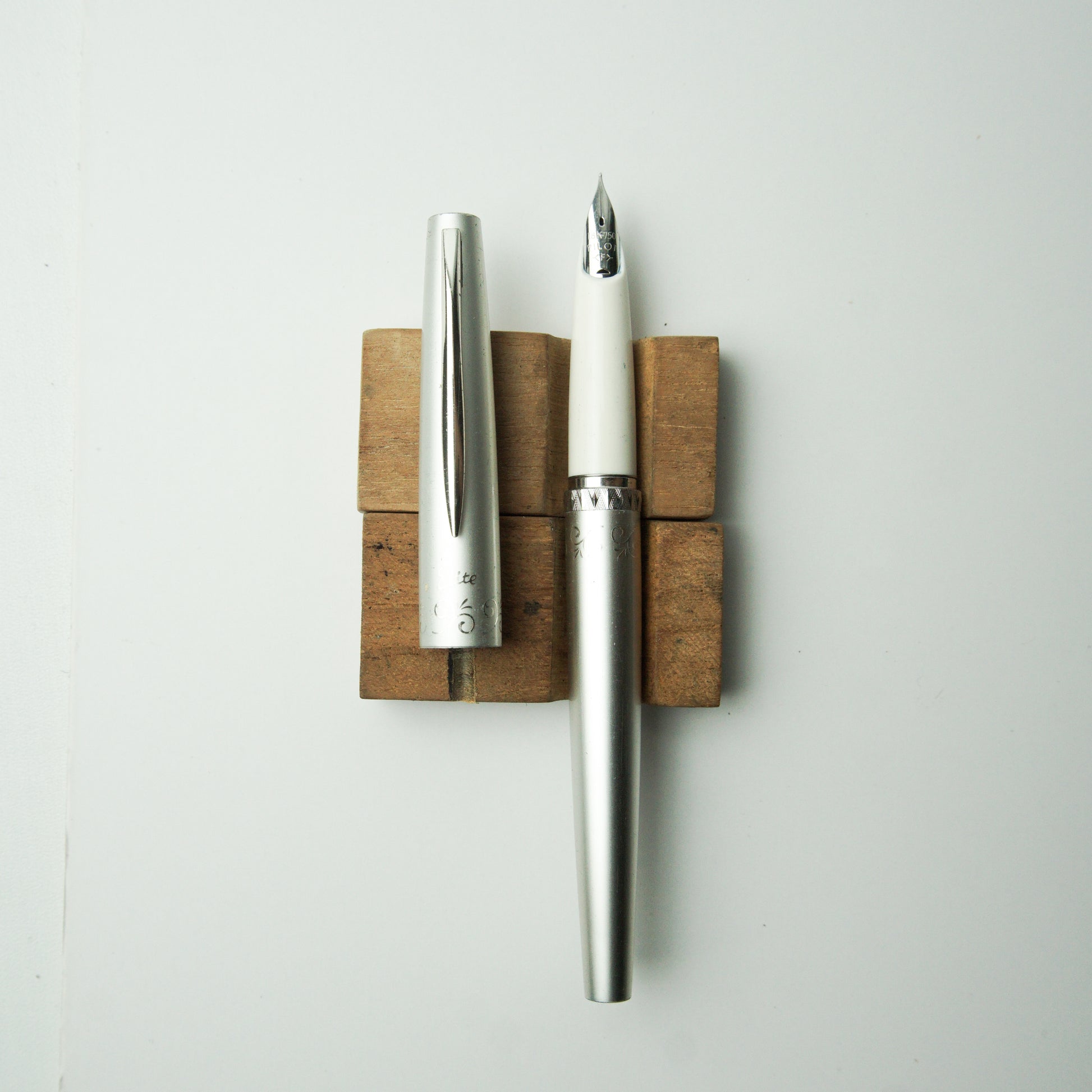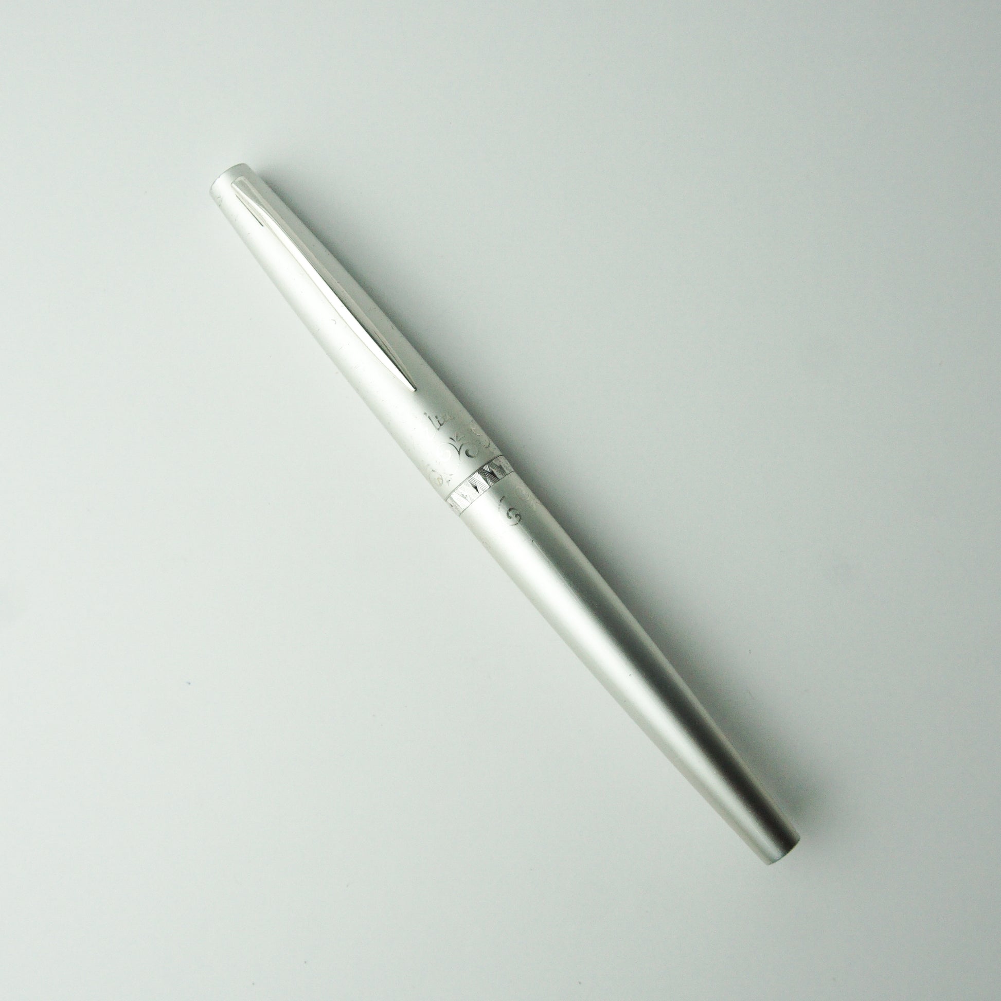 Regular elite from 1970s with aluminum barrel & cap and floral decorated cap band. There are few scratches on the barrel & cap which are quite common for this kind of finishes. Nib is 18K white gold with fine tipping, very sturdy and rigid, inkflow also moderately dry.GRADE: F, FAIR CONDITION (Read our pen grading classification here)