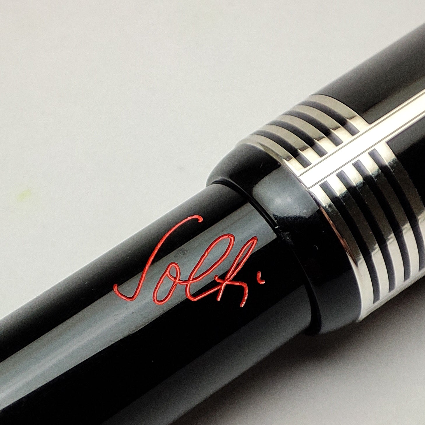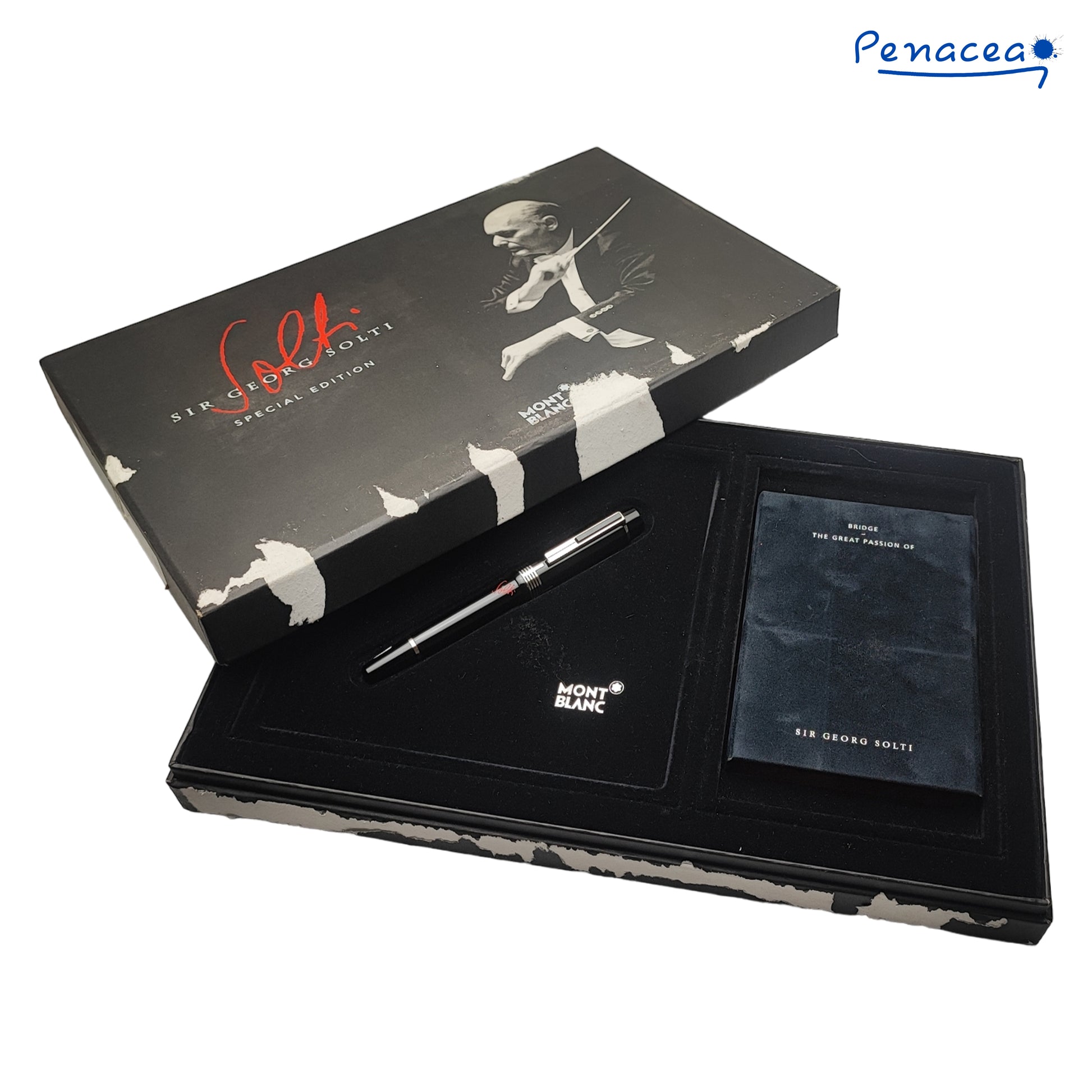 The Montblanc Donation Pen Collection honors world-famous classical musicians of the past decades. The Donation Pen supports carefully selected cultural projects from pioneering artists the world over with a donation of 20 euros per fountain pen and 10 euros per ballpoint or rollerball. This edition pays tribute to Hungarian-British pianist and famed conductor Georg Solti. The clip recalls the instantly recognizable shape of a piano keys, while the cap rings conjure both the strings of the piano and the lines of blank sheet music. Solti's signature on the barrel is emblazoned in bright red, a nod to the hand-written comments he would leave on musical scores in red wax pencil. The cap and barrel are made out of black precious resin combined with platinum-coated fittings, and the rhodium-plated nib is exquisitely engraved with a dove. This pen are in new old stock condition, stickered, paper & booklet, and set of unused bridge card.