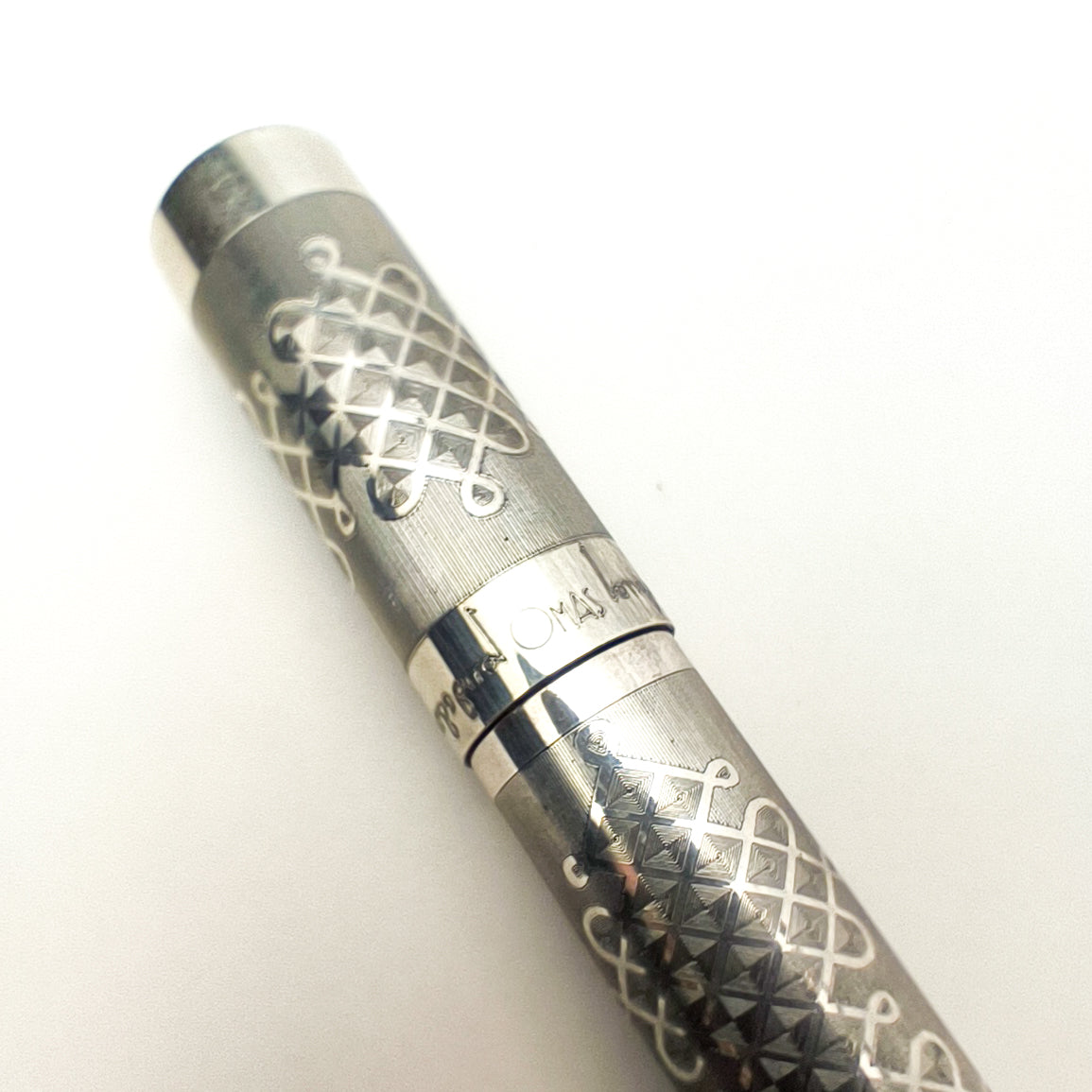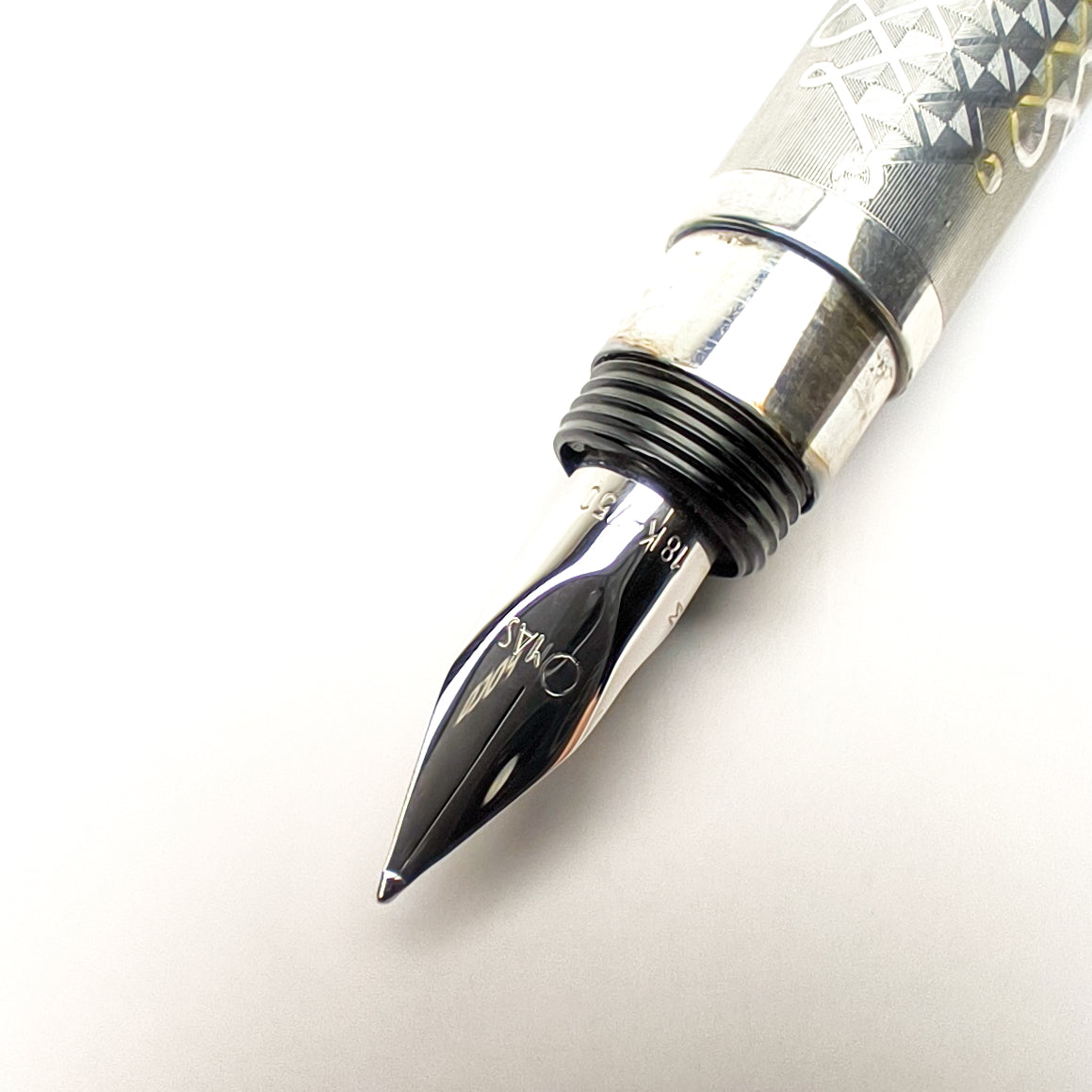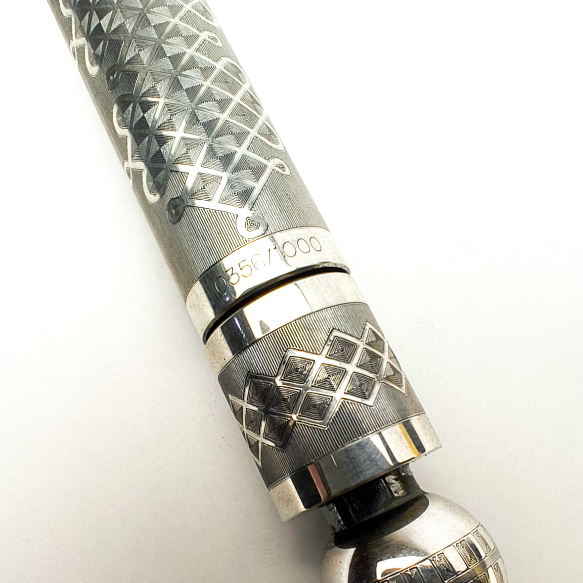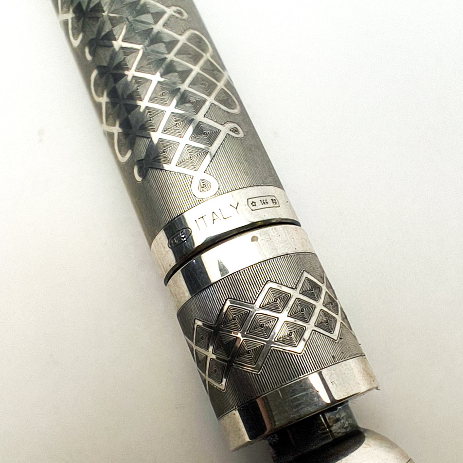 The Italian Renaissance, Leonardo Da Vinci is celebrated in this OMAS Limited Edition. A tiny sphere set with a tiger's eye cabochon in the 18K gold version and a cornelian cabochon in the sterling silver version atop the pen's cylindrical body. Leonardo Da Vinci's knots served as the model for the exquisite embellishment on the body, top, and end parts. The original nib is retained in the hand-crafted ebonite feed, which is both modern and aerodynamic. OMAS pays homage to the Italian intellect and Leonardo da Vinci with Ingegno Scrittorio. This pen are offered in two models, solid 18K gold barrel & cap are limited to 100pcs while the 925 sterling silver version are limited to 1000pcs world wide, this pen numbered 0356/1000, fullset with felt sleeve, wooden box & papers.