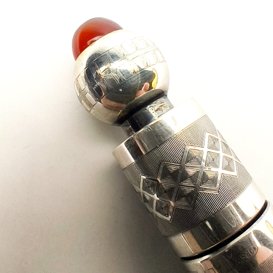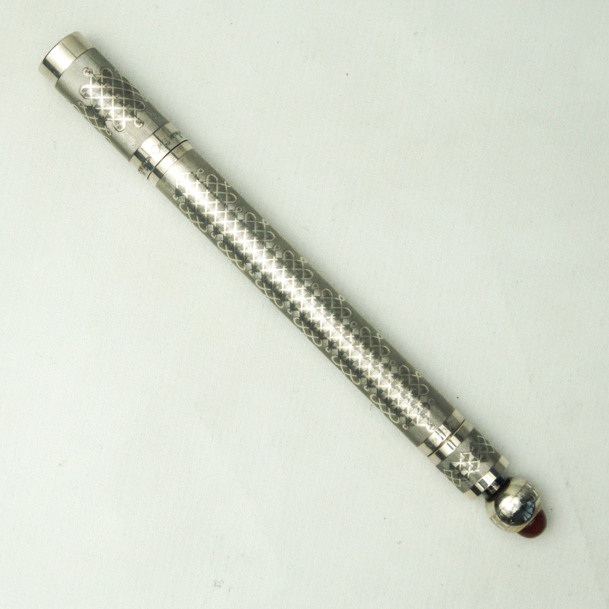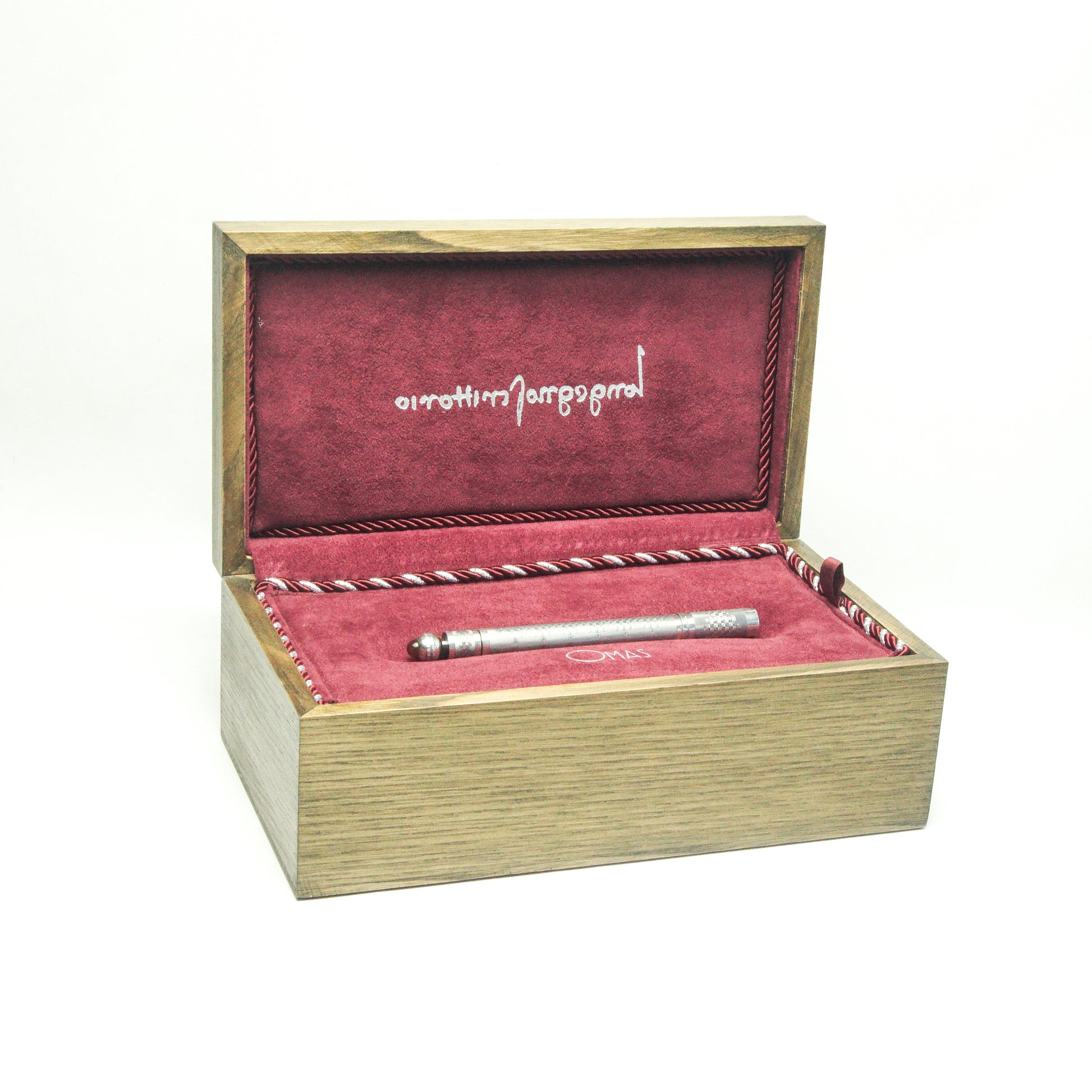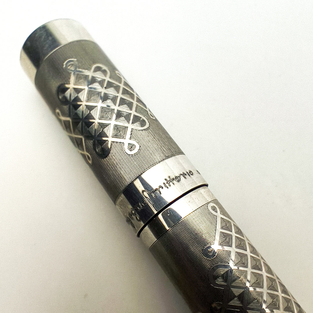 The Italian Renaissance, Leonardo Da Vinci is celebrated in this OMAS Limited Edition. A tiny sphere set with a tiger's eye cabochon in the 18K gold version and a cornelian cabochon in the sterling silver version atop the pen's cylindrical body. Leonardo Da Vinci's knots served as the model for the exquisite embellishment on the body, top, and end parts. The original nib is retained in the hand-crafted ebonite feed, which is both modern and aerodynamic. OMAS pays homage to the Italian intellect and Leonardo da Vinci with Ingegno Scrittorio. This pen are offered in two models, solid 18K gold barrel & cap are limited to 100pcs while the 925 sterling silver version are limited to 1000pcs world wide, this pen numbered 0356/1000, fullset with felt sleeve, wooden box & papers.