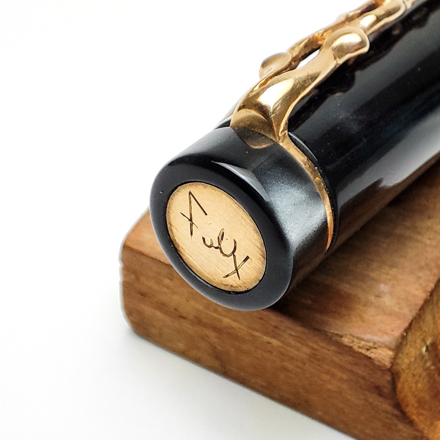 Michael Fultz one of titan in world for fountain pen collector known to make replicas pen from Duofold model with his company Chicago Gold. This replica are based from Duofold international MK II made around 2005, one of his creation before his passing in 2010. This pen are made only 88 unit with 14K gold band on cap and end barrel with signature Michael Fultz logo on blind cap and custom clip.