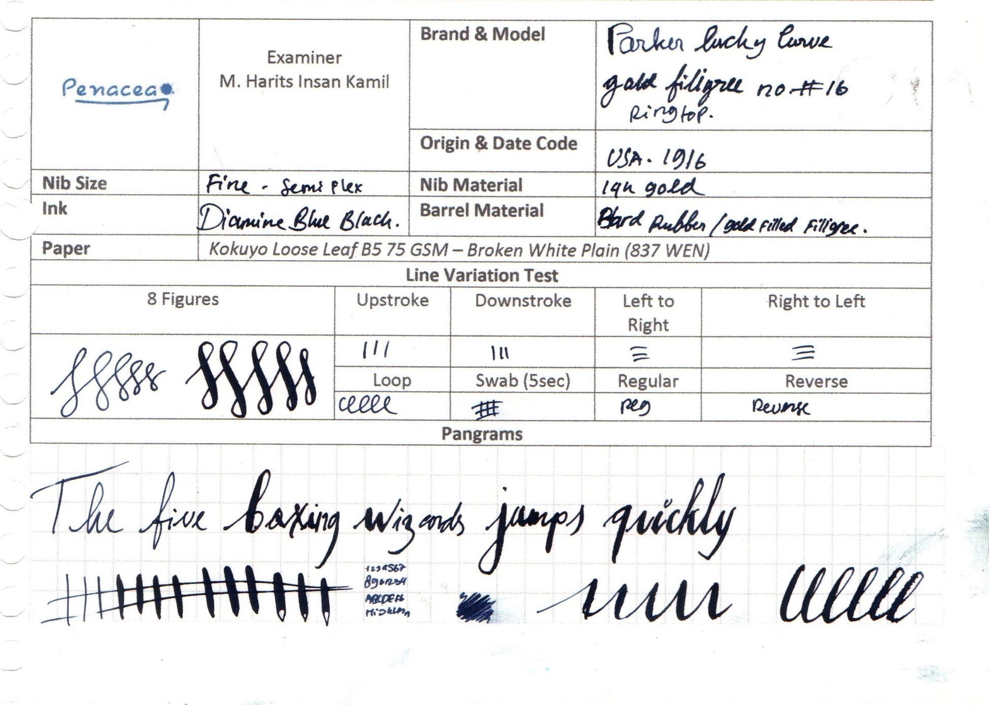 Another century years old Parker Lucky Curve decorated with gold-filled basketweave filigree. This exact pen appears in Parker old catalog released around 1916 features a button filler & a ring top to attach chain to secure the pen when carried in vest. This pen had fully cleaned, adjusted and tuned, inksac has already been replaced with a new one to ensure the filling mechanism working in ready to write state. Pen is in excellent condition without dings, there are microscratch and slight discoloration on the ebonite barrel, the #16 imprint are still visible on the blind cap, bear personalization with late original owner name engraved on the barrel. The writing experience is fantastic with typical vintage flex feedback, decent inkflow and very crisp strokes from Fine (I would consider this extra fine) to Broad (or double broad) with ease.