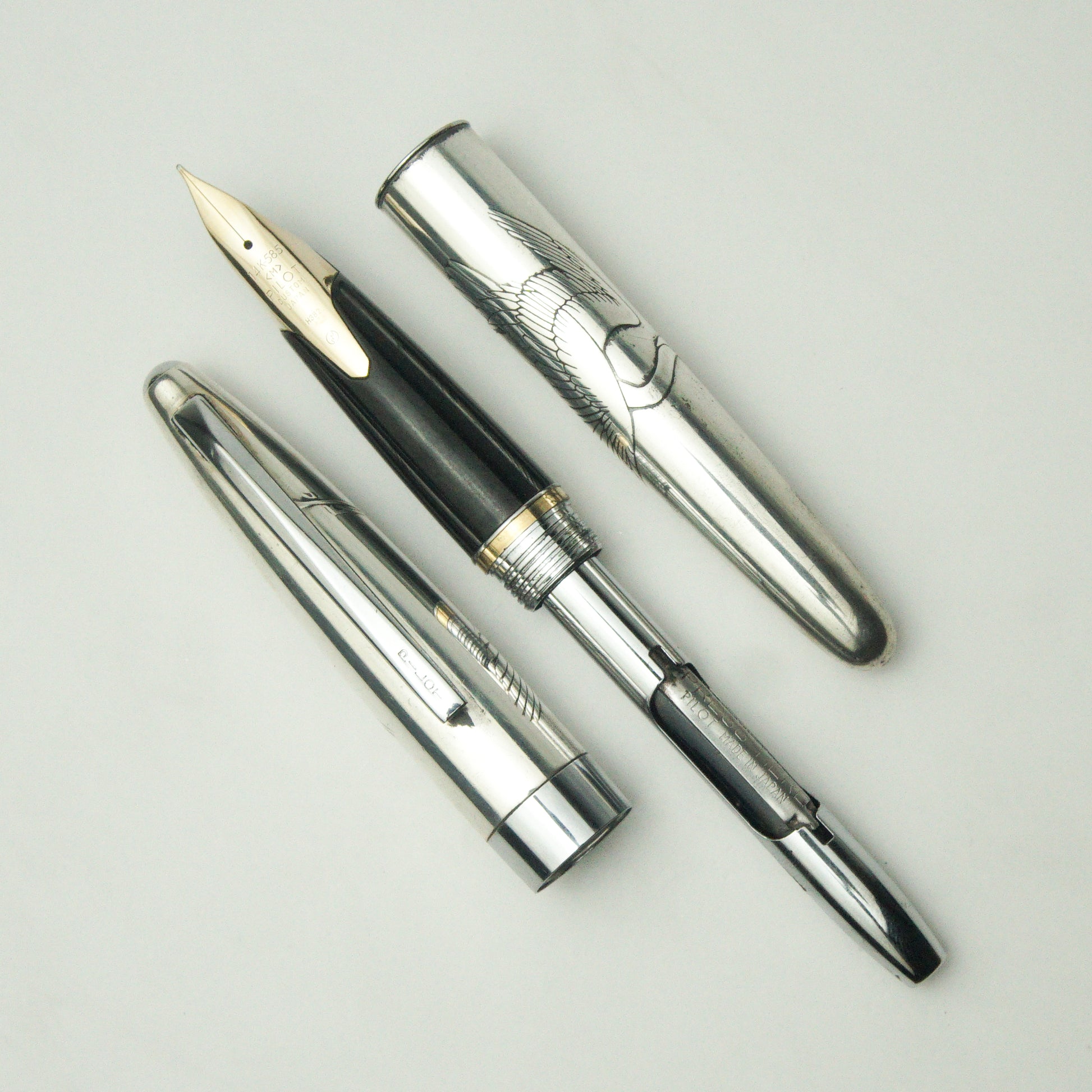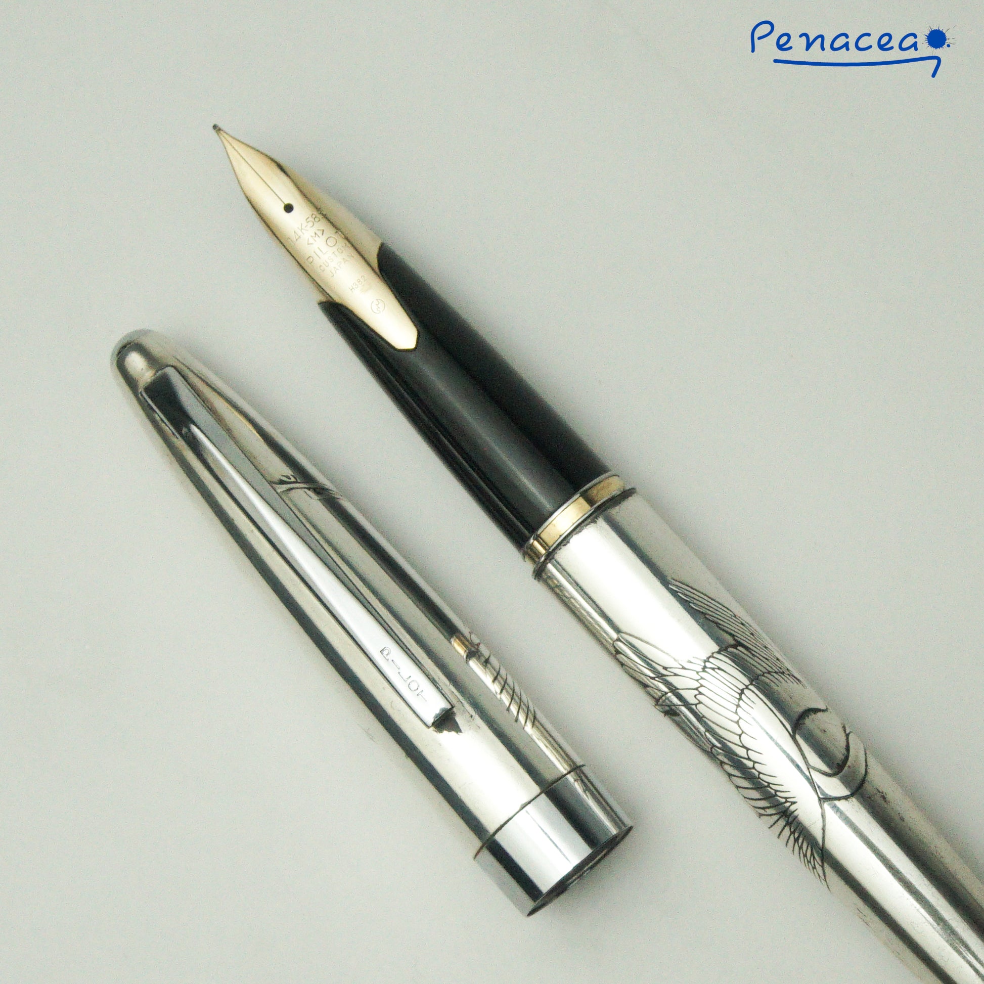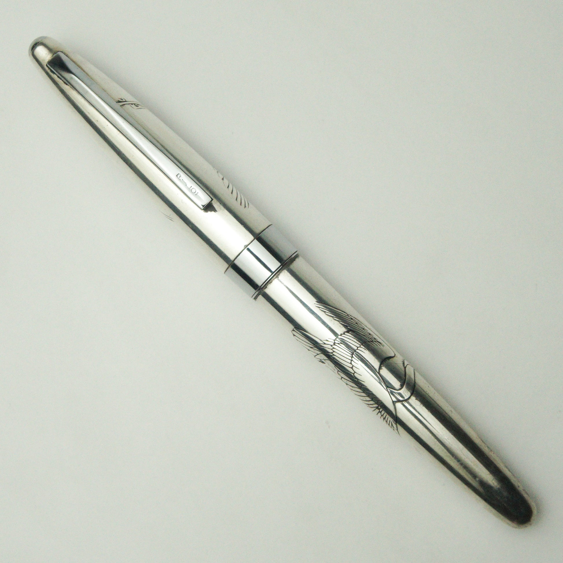 Neo-vintage Pilot silvern art with traditional Japanese crane. Barrel and cap are made from 925 sterling silver, fitted with Pilot converter (CON-20) and 14K Medium nib. Pen is in excellent condition without any dings or dents. Pen only, comes with converter.