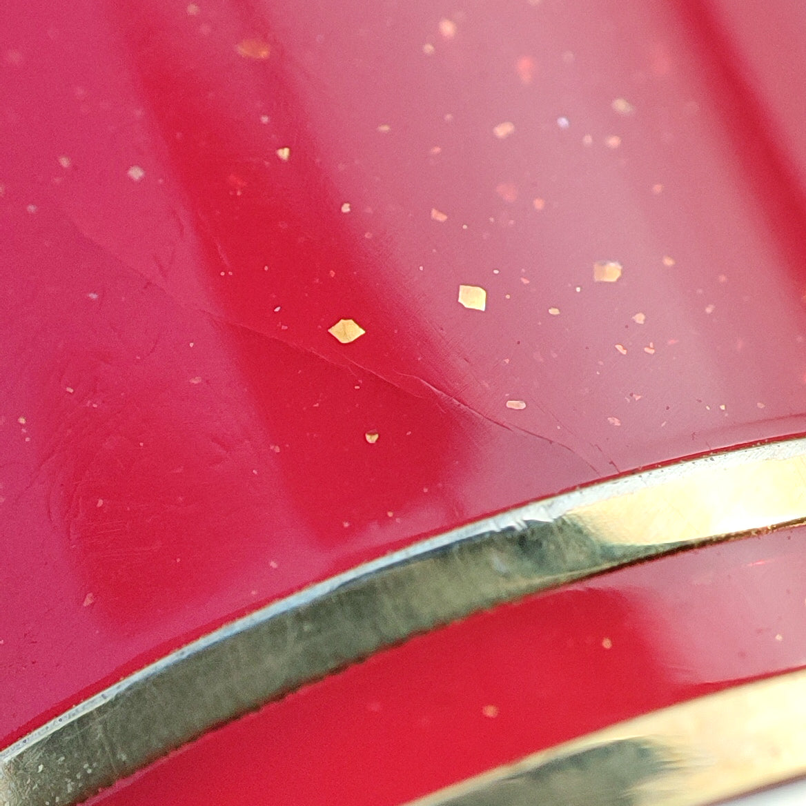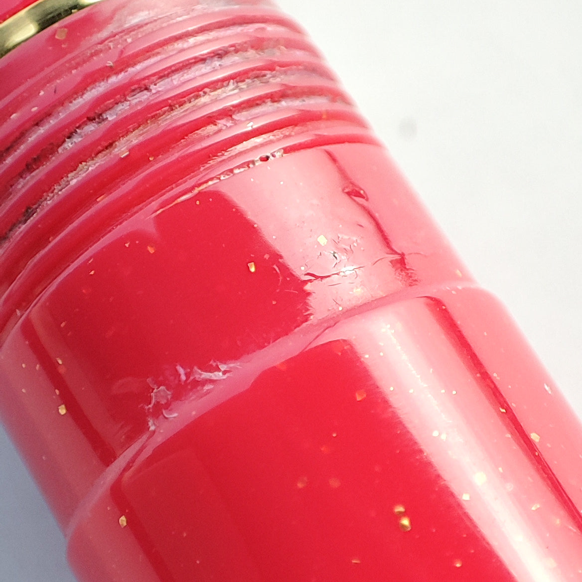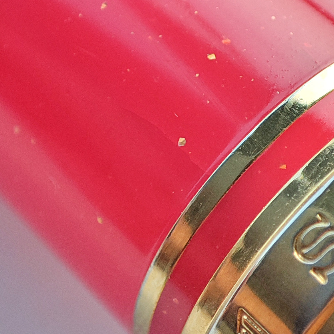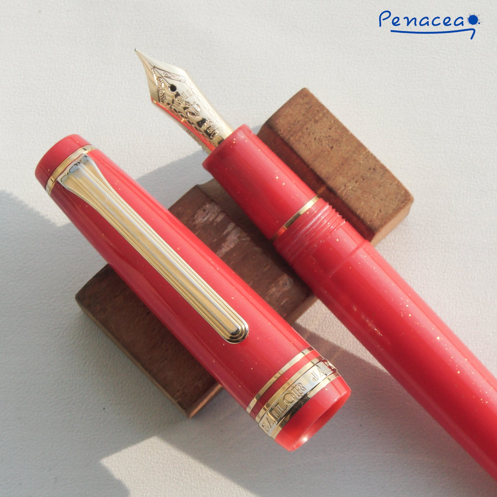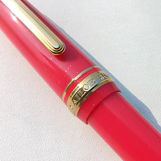 A glittering pink, red resin barrel, cap, and finial, complemented by gold-plated accents, is part of this Gear Pro Sailor Slim Princess Kaguya fountain pen. In the Sailor Shikiori Special Edition collection of Japanese fairy tales, it is one of four colors. In addition to the top finial, a sailor anchor logo appears on the flat top cap. The cap screws open/close and can push to post onto the back of the barrel when writing. Theres 2 hairline crack on the cap and discoloration near cap threads, pen only and paired with brand new Sailor's ink cartridge