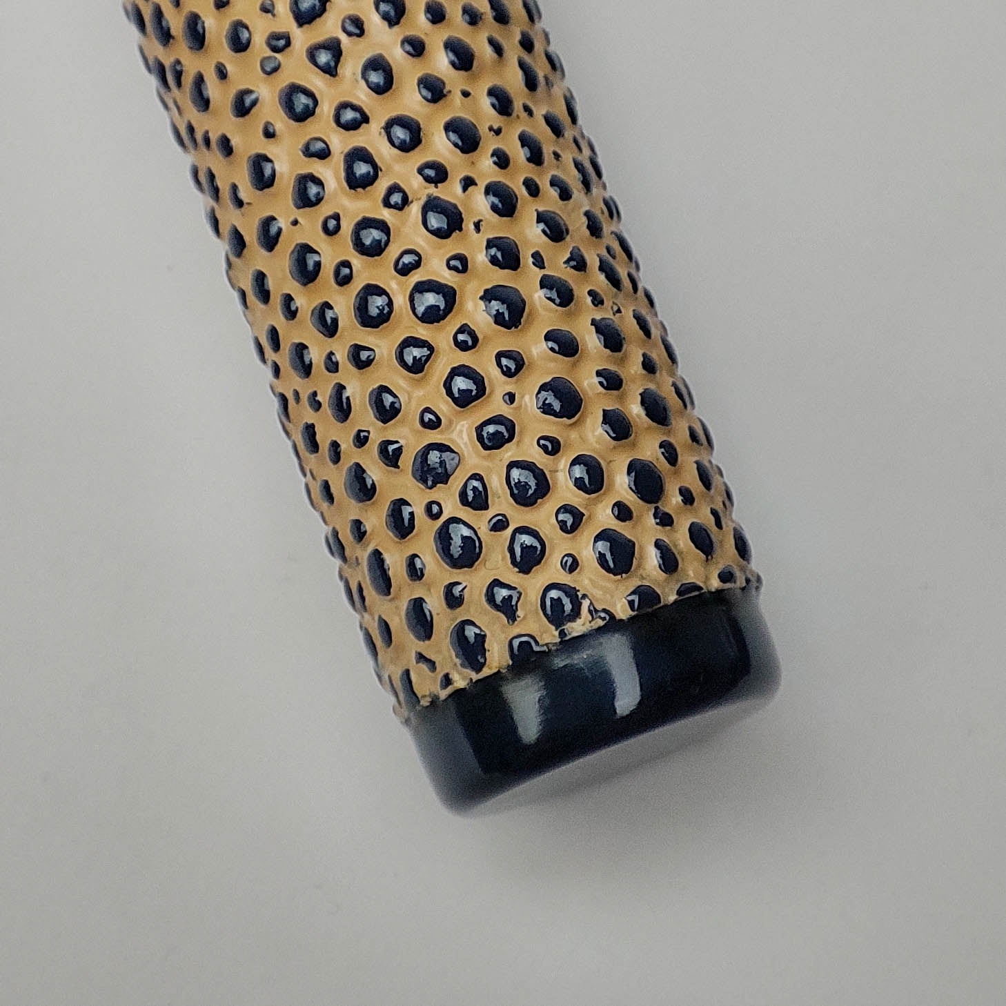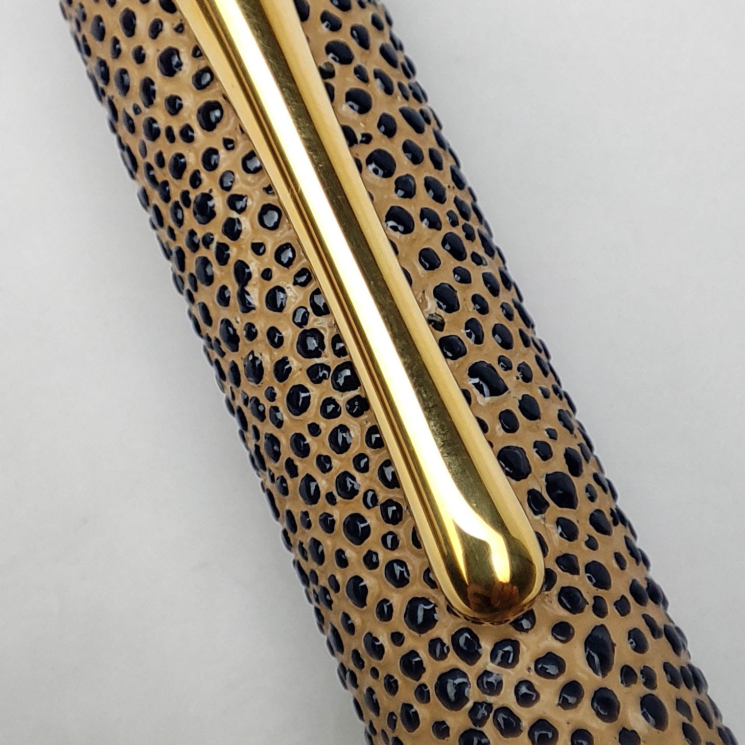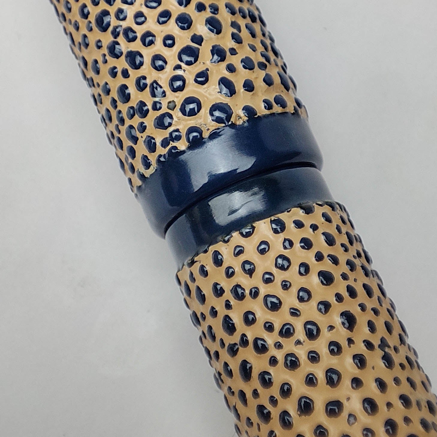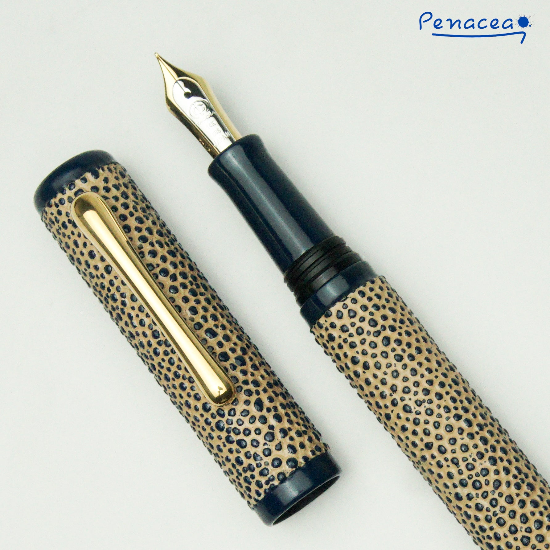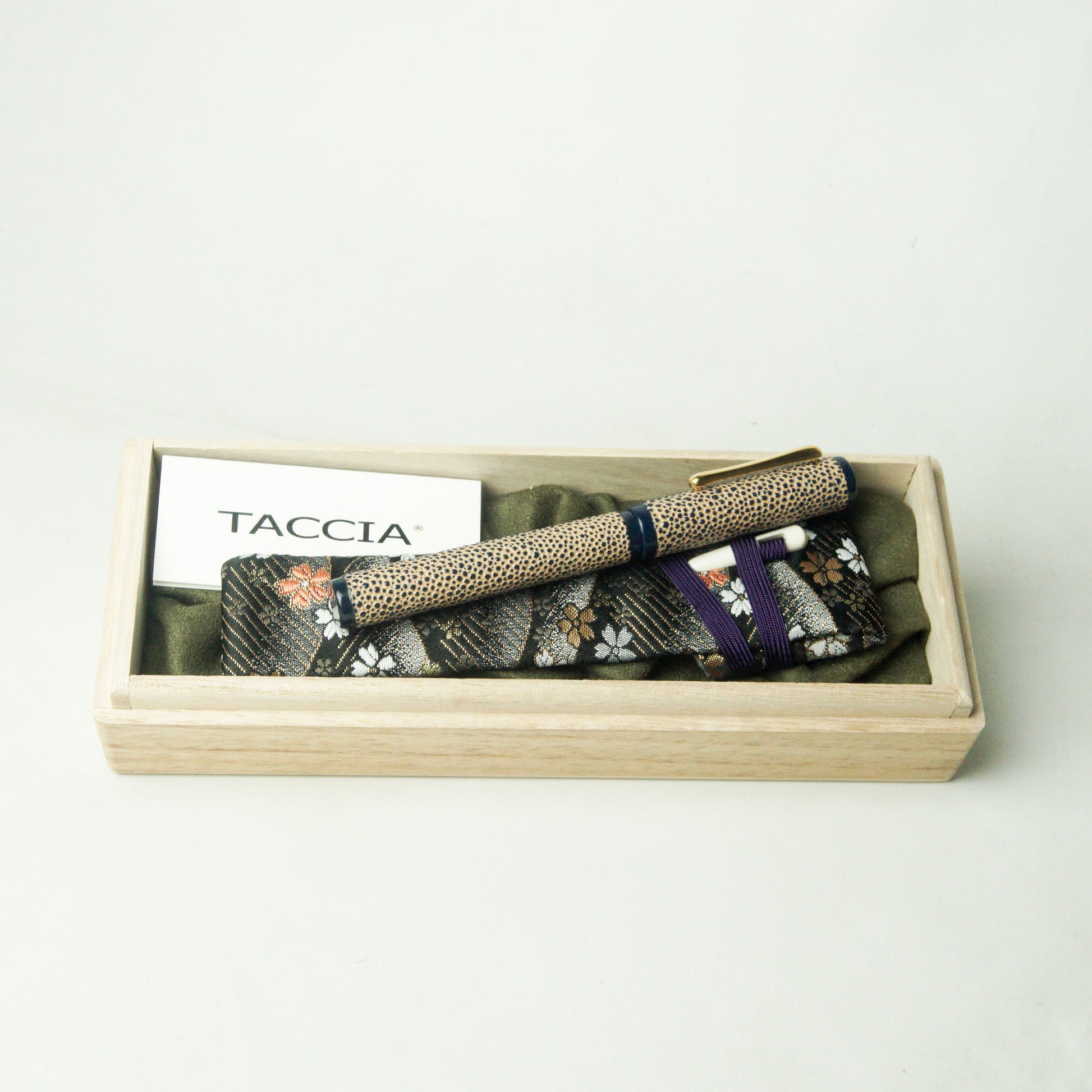 The TACCIA Aquatic LE Collection receives its influence from one of our great seafaring animals – the stingray. A textured, flecked, stingray-like Urushi surface gives way to undulating patterns of a solid custom lacquer below. Each Aquatic LE piece undergoes a meticulous hand-crafted process. Our artist mixes Wajima dirt (or earth) powder with Urushi lacquer to bring out the unique three-dimensional texture of the Aquatic LE. The Urushi is applied and processed onto raw ebonite barrels, and then scrupulously sanded by hand to produce the final piece. Each Aquatic LE piece requires months of lacquer and handwork. Limited to 50 pieces, in fountain pen with 14k gold nib made by SAILOR pen company. The series is available in two patterns: Coral Sea and Sapphire River. This is brand new pen complete with box and papers.