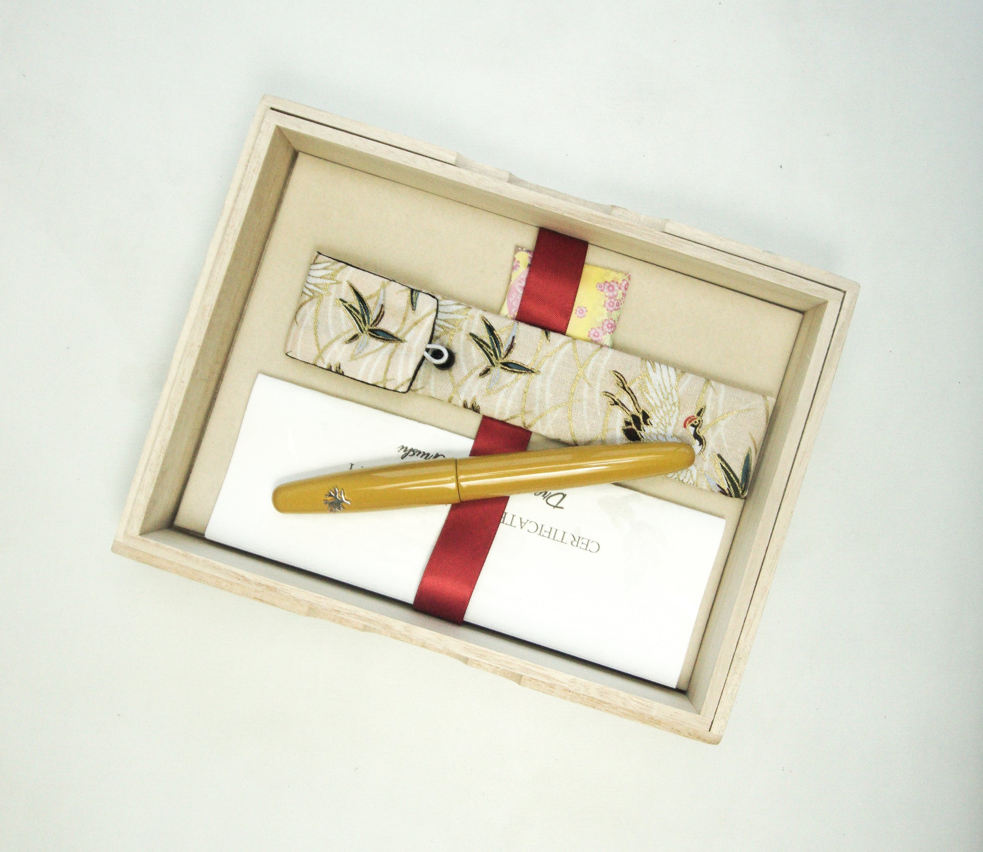 Brand new Wancher true urushi yellow with custom specification as goldplated JoWo nib with plastic feed, tree rollstopper (instead of clip). Fullset box & paper.